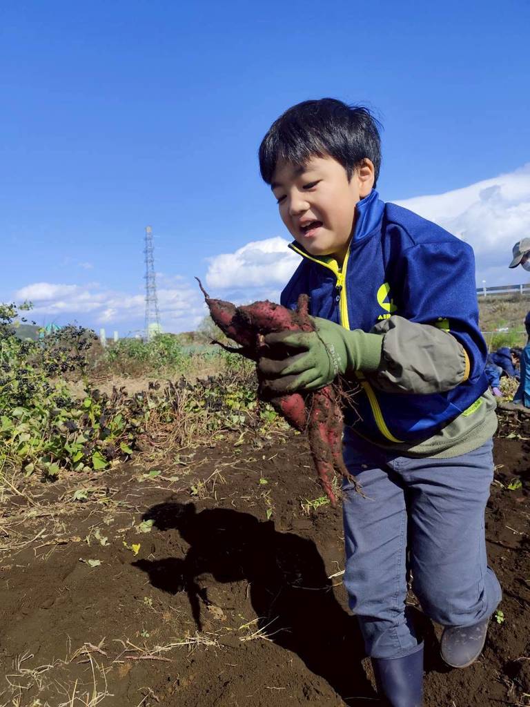 気持ち良い秋晴れ空の下、おじいちゃんおばあちゃんにサポートしてもらいながらさつまいものツルを引っ張っては「大きい~!!」「ちっちゃ~い!!」と歓声が上がりました。