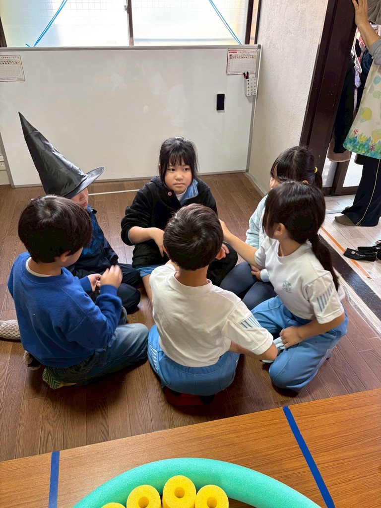 学童傍の児童宅に伺い、出迎えてくださったおじいちゃんに「トリックオアトリート! お菓子をくれないといたずらしちゃうぞ!」と全員で大合唱。