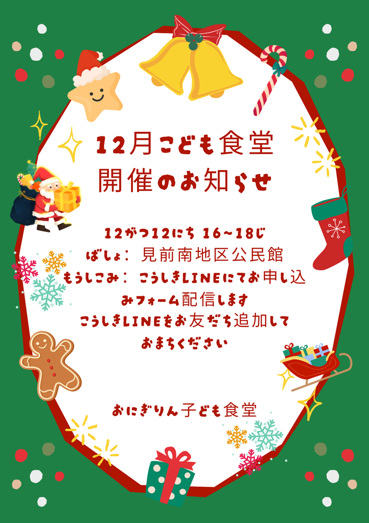 2025年11月27日 / 最終更新日時 : 2025年11月27日 inaho お知らせ 12月子ども食堂開催のお知らせ 12月の子ども食堂開催日が決まりました。 12月12日金曜日16時~18時です。 是非ご参加ください😊